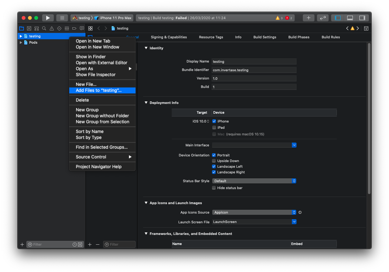 Using Xcode, open the projects /ios/{projectName}.xcodeproj file (or /ios/{projectName}.xcworkspace if using Pods).