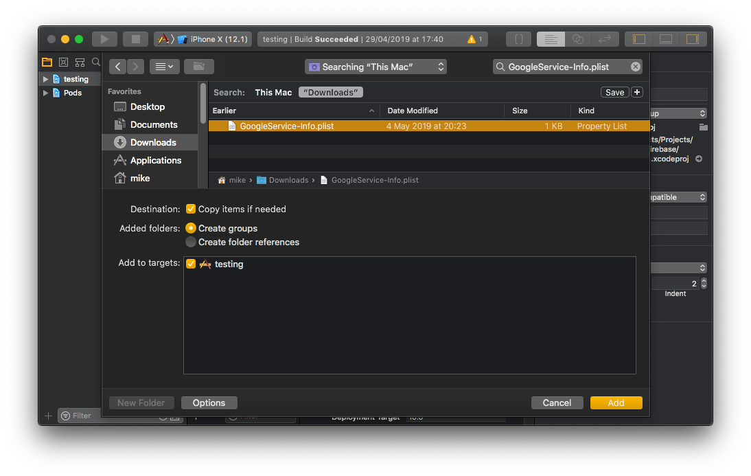 - Move this plist file to the root of your XCode project. If prompted, select to add the config file to all targets as follows: