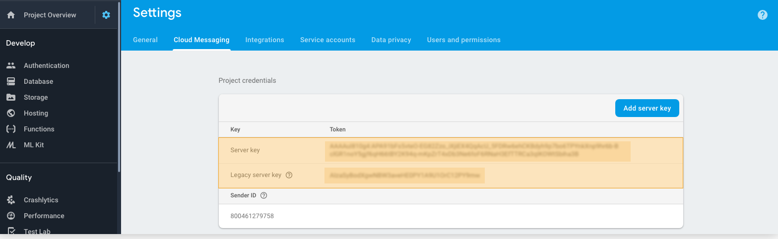 - Select Project Settings and go to the Cloud Messaging tab